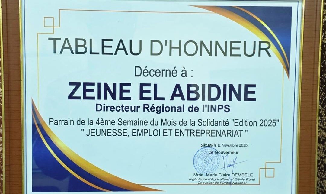 Le 12 novembre 2025, le Directeur régional de l’Institut National de Prévoyance Sociale (INPS) de Sikasso, M. Zein El Abidine, a reçu un tableau d’honneur remis par Mme la Gouverneure. Cette distinction vise à saluer son engagement et son rôle de parrain de la 4ᵉ Semaine du Mois de la Solidarité et de la Lutte contre l’Exclusion.